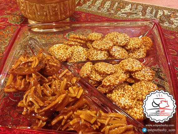 ۲- به جای خلال بادام و کنجد می توانید از خلال پسته و یا هر نوع آجیل دیگری که دوست دارید استفاده کنید.